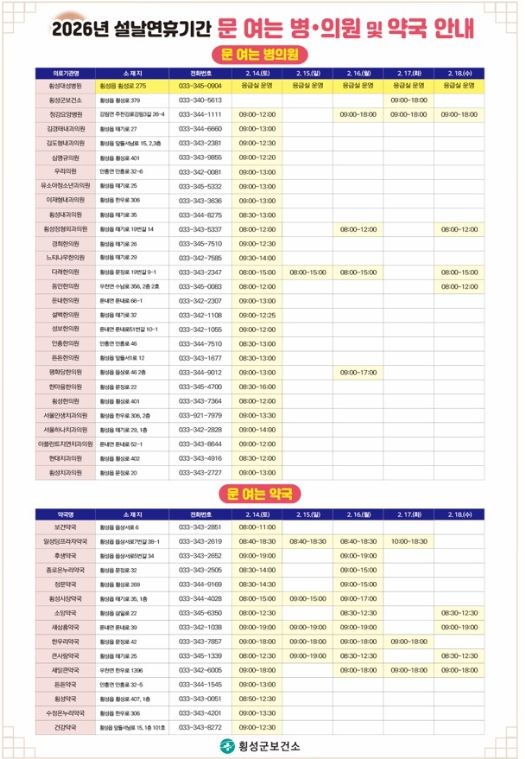 횡성군보건소에 따르면 2월 17일 설날 당일에는 보건소에서 오전 9시부터 오후 6시까지 진료를 실시해, 연휴 기간 발생할 수 있는 경증 환자 및 응급 상황에 대비할 계획이다.