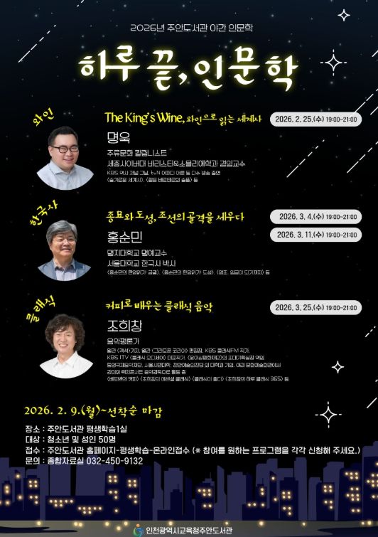 [ 타임즈 - 김시창 기자 ] 인천광역시교육청주안도서관은 2월부터 3월까지 시민들이 다양한 인문학 주제를 접할 수 있는 야간 인문학 프로그램 ‘하루 끝, 인문학’을 운영한다.