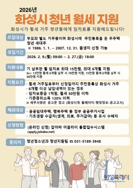 [ 타임즈 - 김시창 기자 ] 화성특례시가 청년들의 주거비 부담을 덜고 안정적인 주거 생활을 지원하기 위해 2월 9일부터 2월 27일까지‘청년 월세 지원 사업’ 신청자를 모집한다고 밝혔다.