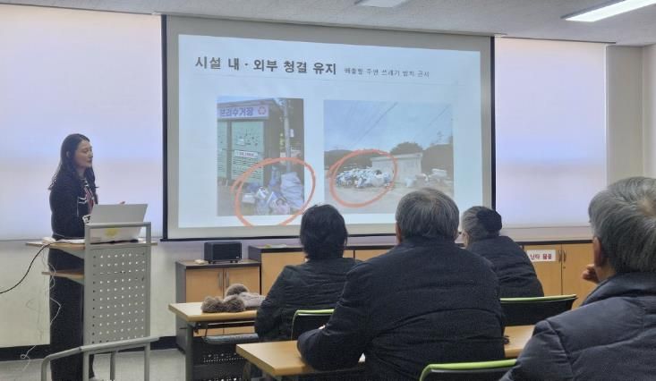 주요 교육 내용은 현장에 바로 적용할 수 있도록 실무 중심으로 구성됐으며 △재활용 가능 자원의 올바른 분리배출 요령 △거점배출시설 운영 및 관리 방법 △불법·미분리 배출 쓰레기 처리 요령 등이다. 특히 반복적으로 발생하는 분리배출 혼선 사례를 중심으로 현장에서 겪는 애로사항 해결에 중점을 두었다.