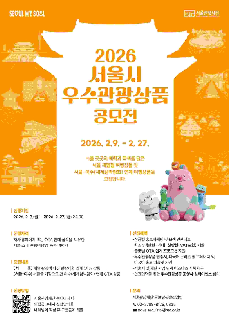 □ 서울시와 서울관광재단(대표이사 길기연)은 서울의 매력을 즐길 수 있는 체험형 관광상품을 발굴‧육성하기 위해「2026 서울시 우수관광상품 공모전」을 2월 9일(월)부터 27일(금)까지 진행한다.