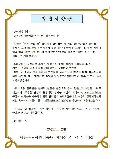 [ 타임즈 - 김시창 기자 ] 인천시 남동구 도시관리공단은 청렴 문화 정착을 위해 공사, 용역, 물품 관련 업체와 전 직원에게 ‘청렴 서한문’을 발송했다고 11일 전했다.
