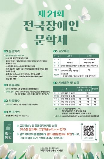 [ 타임즈 - 김시창 기자 ] 고양시장애인종합복지관은 3월 19일까지 전국의 장애인 및 장애인 가족을 대상으로 ‘제21회 전국장애인문학제’ 작품 접수를 진행한다.
