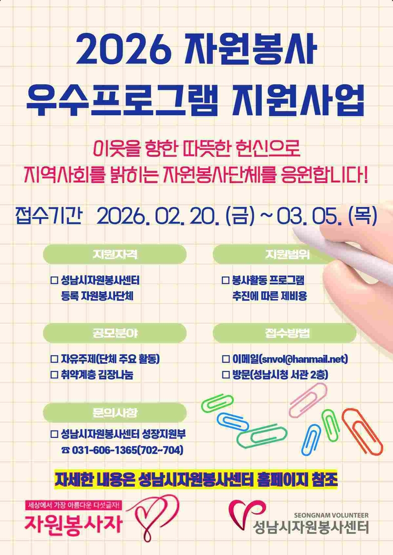 [ 타임즈 - 김시창 기자 ] 성남시자원봉사센터(센터장 장현자)는 자원봉사단체 활동 지원을 통해 단체의 성장을 도모하고, 자원봉사 활성화를 기하고자 「2026 자원봉사 우수프로그램 지원사업」을 추진하고, 오는 2월 20일부터 3월 5일까지 참여 단체를 공개 모집한다고 밝혔다.