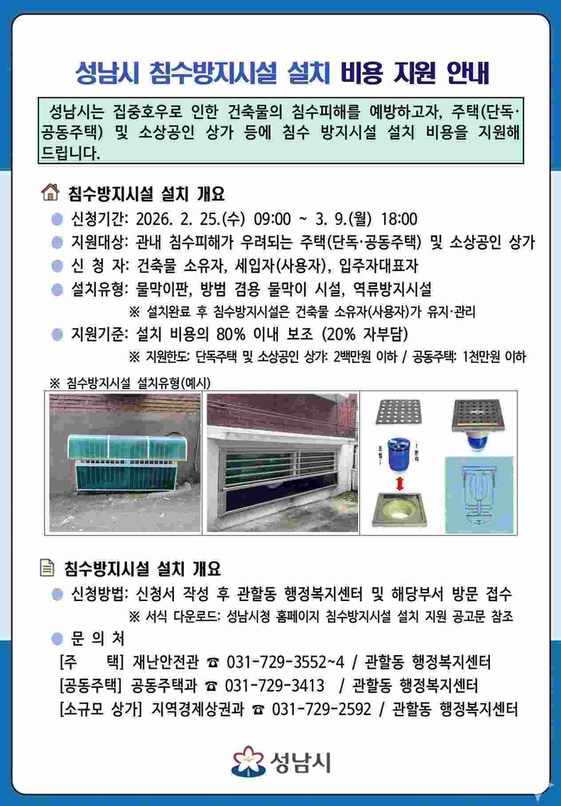 성남시 관계자는 “집중호우로부터 시민의 생명과 재산을 보호하기 위한 사업인 만큼, 침수 피해 예방을 위해 적극적인 신청을 당부드린다”고 말했다.