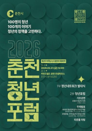 춘천시가 27일 커먼즈필드 안녕하우스에서 ‘2026 춘천시 청년네트워크 발대식 및 청년포럼’을 개최한다. 시는 앞서 공개 모집을 통해 제1기 청년네트워크 위원 30명을 선발했다. 이번 행사는 청년이 정책의 수혜자를 넘어 설계자로 참여하는 소통 창구를 공식화하고 ‘청년이 머무는 도시, 춘천의 미래전략’을 모색하기 위해 마련됐다.