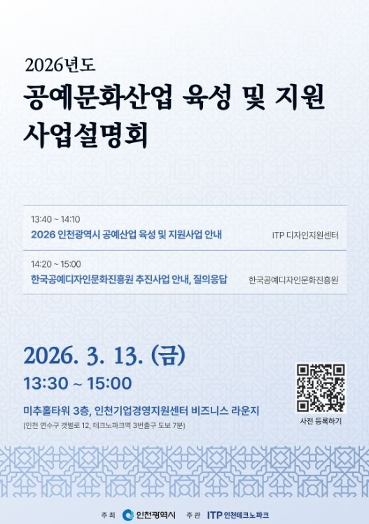 [ 타임즈 - 김시창 기자 ] 인천테크노파크(인천TP)는 오는 13일 인천기업경영지원센터(송도 미추홀타워 3층)에서 ‘2026년도 인천광역시 공예문화산업 육성 및 지원사업 설명회’를 개최한다고 밝혔다.