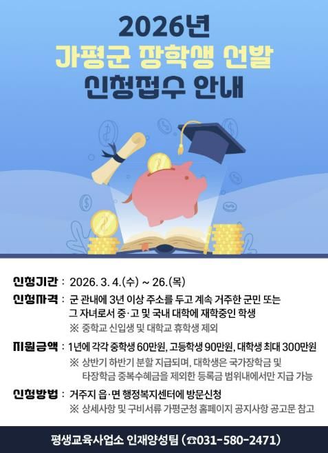 [ 타임즈 - 김시창 기자 ] 가평군이 지역 학생들의 균등한 교육 기회를 보장하고 우수 인재를 육성하기 위해 2026년도 장학생 선발에 나선다.