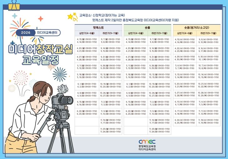 또한 수‧목요일에 운영되는 숏폼 제작 과정은 원거리 및 소규모 학교를 우선 선정해 운영한다. 단양‧제천‧충주‧영동‧옥천 지역 학교와 6학급 이하 소규모 학교를 대상으로 우선 선정 기준을 적용해 지역 간 미디어 교육 격차를 완화하고 교육 접근성을 높일 계획이다.