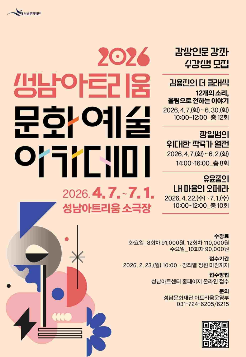 [ 타임즈 - 김시창 기자 ] 성남문화재단(대표이사 윤정국)은 시민들이 예술의 깊은 울림을 보다 가까이에서 접할 수 있는 ‘성남아트리움 2026 문화예술 아카데미’를 운영한다.