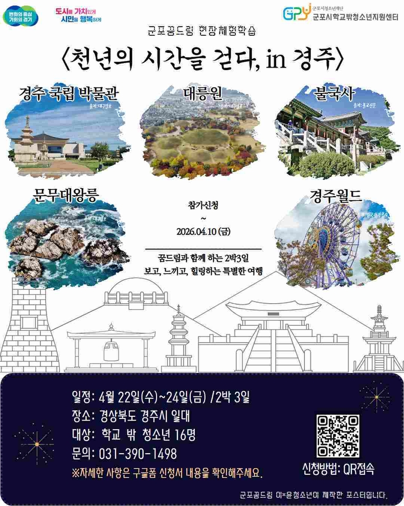 [ 타임즈 - 김시창 기자 ] (재)군포시청소년재단(대표이사 김덕희) 군포시학교밖청소년지원센터(센터장 강연미)는 학교 밖 청소년 16명을 대상으로 오는 4월 22일부터 24일까지 2박 3일간 경상북도 경주시 일대에서 ‘역사캠프 현장체험학습 프로그램’을 운영한다고 밝혔다. 참가신청은 구글폼 등을 통해 접수 받은 뒤 신청 내용을 바탕으로 참여 대상자를 선정할 예정이다.
