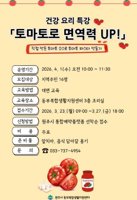 [ 타임즈 - 김시창 기자 ] 원주시 동부복합생활지원센터는 오는 23일부터 ‘토마토로 면역력 업(UP)!’ 건강 요리 특강 프로그램 참여자를 모집한다.