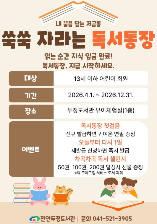 [ 타임즈 - 김시창 기자 ] 천안시 두정도서관은 내달부터 어린이들의 독서습관 형성을 위한‘쑥쑥 자라는 독서통장’프로그램을 운영한다고 18일 밝혔다.