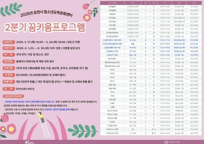 모집 대상은 관내 유아·청소년·성인이며, 신청은 3월 24일 오후 6시까지 포천시청소년교육문화센터 누리집을 통해 선착순으로 진행된다.