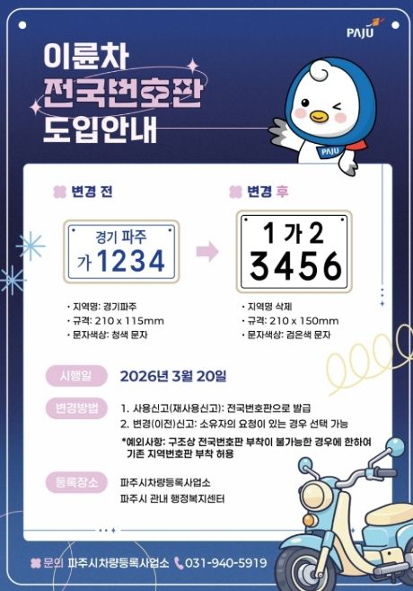 [ 타임즈 - 김시창 기자 ] 파주시는 오는 20일부터 이륜차 전국번호판 제도를 본격 시행한다.