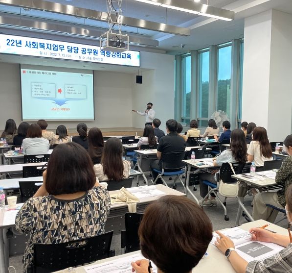 이번 교육은 그동안 코로나19로 인해 업무교류 기회가 축소되면서 복지제도 확대 및 변경 등에 있어 누락 되기 쉬운 복지 실무를 중심으로 읍면동 복지서비스 현장에서 주민과 최접점에 있는 사회복지 담당자와 간호직 공무원의 직무 역량을 향상 시키기 위해 마련됐다.