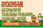 [ 타임즈 - 김시창 기자 ] 천안시농업기술센터는 오는 25일까지 ‘상반기 신규농업인 기초영농기술교육’ 참여자를 모집한다고 13일 밝혔다. 교육은 천안시로 이주한 지 5년 이내인 신규농업인과 귀농을 희망하는 시민으로, 모집인원은 30명이다. 교육은 내달 3일부터 6월 5일까지 10회에 걸쳐 귀농·귀촌 이해, 주요 작물 기술교육, 관련 법률 및 현장교육 등이 진행될 예정이다. 교육 신청은 천안시농업기술센터에 방문접수하거나 천안시통합예약시스템을 통해 온라인으로도 가능하다. 김양섭 천안농업기술센터 소장은 “이번 교육을 통해 농촌사회에 안정적으로 정착할 수 있길 바란다”며 “귀농 활성화를 위해 다양한 교육을 지속적으로 추진할 것”이라고 말했다.