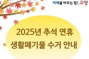 [ 타임즈 - 김시창 기자 ] 고양특례시는 다가오는 추석 연휴를 맞아 시민들이 쾌적하고 깨끗한 환경 속에서 명절을 보낼 수 있도록 ‘추석 연휴 생활쓰레기 관리대책’을 수립해 본격 추진한다. 시는 10월 3일부터 9일까지 연휴 기간 동안 상황반과 기동청소반을 운영해 각종 민원과 긴급 상황에 신속 대응하고, 생활쓰레기와 무단 방치쓰레기를 집중 수거할 예정이다. 아울러 연휴 기간 쓰레기 배출일 사전홍보와 쓰레기 상습 투기 우려지역에 대한 집중 단속도 병행한다. 특히, 10월 8일 대체공휴일에도 생활쓰레기 수거를 정상적으로 실시해 시민 불편을 최소화할 방침이다. 다만, 10월 5일, 6일(월·추석), 7일 3일간은 휴무로 인해 수거가 이뤄지지 않는다. 이에 따라 쓰레기 배출은 반드시 수거일 전날 일몰 이후에 해야한다. 시 관계자는 “쾌적하고 깨끗한 명절 분위기 조성을 위해 추석 연휴 기간 생활쓰레기 수거에 만전을 기하겠다”며 “각 가정에서도 음식물 쓰레기 줄이기, 재활용품 분리배출 등 생활쓰레기 감량에 적극 협조해 주시기를 바란다”고 전했다.