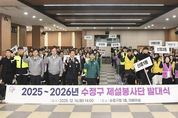 [ 타임즈 - 김시창 기자 ] 성남시는 폭설에 대응하기 위해 수정, 중원, 분당 등 구별로 시민들이 참여하는 제설봉사단을 구성해 운영하고 있다고 18일 밝혔다. 이를 위해 수정구는 지난 12월 16일 오후 2시 구청 1층 대회의실에서 수정경찰서와 합동 대책회의를 하고, 제설봉사단 발대식을 개최했다. 수정구는 경찰과의 합동 대책회의 자리에서 지난 12월 4일 단시간에 집중된 폭설 당시의 현장 대응체계를 점검하고, 도로 교통혼잡과 안전사고 발생을 최소화하기 위한 기관 간 협력 방안과 대응 매뉴얼을 논의했다. 이어진 수정구 제설봉사단 발대식엔 전체 단원 1122명 가운데 100명이 참석해 폭설로 인한 주민 불편을 최소화하고 적극적인 제설 자원봉사 활동에 참여할 것을 다짐했다. 제설봉사단은 강설 시 이면도로 경사로, 보도, 육교 등 제설 취약 지역에 우선 투입된다. 전경만 수정구청장은 “제설봉사단은 제설 작업 이외에도 ‘내 집 앞, 눈 치우기’를 주변에 적극적으로 홍보해 주민들의 관심과 협조를 이끌어 내는 역할도 중요하다”면서 “민‧관‧경의 유기적인 협력을 통해 주민들이 안전하게 겨울을 날 수 있도록 노력해 나가겠다”고 말했다. 구별 제설봉사단 인원은 중원구 954