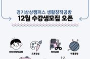 [ 타임즈 - 김시창 기자 ] 경기문화재단 경기상상캠퍼스(대표이사 유정주)는 겨울 시즌 생활창작공방 프로그램 참여자를 오는 17일부터 모집한다. 생활창작공방은 경기상상캠퍼스 생생1990에 위치한 경기생활문화센터 교육 커뮤니티 공간으로, 도민이 일상 속에서 다양한 창작 활동을 경험할 수 있도록 재단공방, 어린이창작공방, 드로잉실, 취미공방, 직물공방, 커피공방, 사진촬영실까지 총 7개의 특화 공간을 운영하고 있다. 11월에는 총 11개의 프로그램이 구성돼 있으며, 주요 프로그램으로는 △Set in wool(울조끼와 가방 만들기), △오롯이 나에게 집중하는 시간: 4주 터프팅 힐링 프로젝트, △내 생애 첫 그림- 알기 쉬운 민화'일월오봉도', △그림책 마음 놀이터 등이 있다. 12월에는 △오일파스텔로 만드는 2026년 달력 △우리들의 예술놀이터, △복을 담는 라탄 복조리 만들기, △복을 쓸어 담는 모시 빗자루 만들기, △커피의 감별과 추출 방법: 커핑까지 총 5개의 프로그램이 운영될 예정이며, 수강 신청은 11월 14일부터 각 프로그램 시작 4일 전까지 경기상상캠퍼스 누리집을 통해 가능하다. 경기상상캠