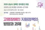 [ 타임즈 - 김시창 기자 ] 성남시장애인권리증진센터(센터장 국신호, 이하 센터)는 12월 9일(화) 오후 3시, 성남시니어산업혁신센터 대강당에서 「2025 성남시 장애인 권리증진 포럼」‘고령장애인 지원정책의 방향과 과제’를 개최한다고 밝혔다. 이번 포럼은 고령화와 장애가 동시에 나타나는 복합 취약계층의 지원 필요성을 주제로, 고령장애인의 권리 보장과 정책적 대응 방향을 논의하기 위해 마련되었다. 포럼은 경기복지재단 이병화 연구위원의 기조발제를 시작으로, 강남대학교 이준우 교수(좌장) 가 진행하는 지정토론이 이어질 예정이다. 지정 토론에는 • 성남시장애인주간이용시설협회 이진승 회장 • 경기도남부 지역장애인보건의료센터 김희성 팀장 • 성남시정연구원 권순범 연구위원 • 한국장애인부모회 김해경 성남지부장 • 성남시종합사회복지관협회 조재광 사무국장이 참여한다. 센터는 “고령장애인의 의료·돌봄·주거·여가 등 다방면의 정책적 대응이 필요한 시점”이라며, “이번 포럼을 계기로 지역 차원의 협력체계를 강화하고 실천 가능한 정책방향을 논의할 수 있기를 기대한다”고 밝혔다. 포럼은 고령장애인 정책에 관심 있는 누구나 참여할 수 있으며, 자세한 문의는 성남시장애인권리증진센터(☎