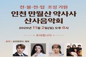 [ 타임즈 - 김시창 기자 ] 인천광역시는 오는 11월 2일 오후 6시, 남동구 간석동 만월산 약사사에서 ‘만월산 약사사 산사음악회’를 개최한다고 밝혔다. 이번 음악회는 인천시가 후원하고 인천불교총연합회가 주최, 약사사가 주관하는 가을 대표 문화행사로, 도심 속 사찰을 문화무대로 확장해 시민이 함께 즐길 수 있는 열린 힐링 축제로 기획됐다. 1932년 창건된 약사사는 대한불교화엄종의 총본산으로, 도심 속에서도 고요함과 전통미를 간직한 인천의 대표 사찰이다. 이번 공연은 ‘종교를 넘어 시민 모두가 행복을 나누는 시간’을 주제로, 불교문화와 대중음악이 함께 어우러지는 색다른 감동의 무대가 될 전망이다. 약사사 금강합창단의 찬불가 무대로 시작해 불교적 선율 속에 마음의 평안을 전한다. 이어 퓨전국악그룹‘이상’이 전통 국악과 현대적 리듬을 결합한 색다른 무대를 선보이며, 색다른 음악적 감성을 선사한다. 또한 가수 박서진, 나영, 정슬, 별빛 등 대중에게 사랑받는 초대가수들이 트로트와 감성가요를 통해 남녀노소가 함께 즐길 수 있는 다채로운 무대를 펼칠 예정이다. 윤도영 시 문화체육국장은 “산사음악회는 시민들이 일상 속에서 문화와 예술을 가까이 즐길 수 있도록 마련된