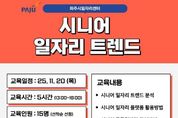 [ 타임즈 - 김시창 기자 ] 파주시는 10월 17일부터 11월 12일까지 ‘시니어 일자리 트렌드’ 교육에 참여할 교육생 15명을 모집한다. 이번 교육은 노년층의 취업률 향상을 위한 프로그램으로, 파주시에 거주하는 60세 이상 구직자를 대상으로 진행된다. 교육 과정은 ▲노인 일자리 동향 ▲일자리 유형별 특징 ▲참여 절차 및 취업 연계 방안 등이며, 노년층이 실제 일자리에 참여하는 데 필요한 정보를 습득할 수 있도록 구성됐다. 교육 신청은 파주시 일자리센터 또는 문산·운정행복센터 내 일자리 상담 창구 방문 또는 온라인(구글 서식)을 통해 할 수 있다. 이이구 민생경제과장은 “최근 노인 일자리는 인구 고령화에 따라 다양화되고 전문화되는 추세”라며 “이번 교육을 통해 어르신들이 자신의 경험과 역량을 살려 적성에 맞는 일자리를 찾고, 보다 활기찬 노후를 설계하기를 바란다”라고 말했다.
