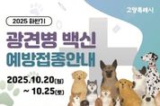 [ 타임즈 - 김시창 기자 ] 고양특례시는 2025년 하반기 광견병 예방접종을 10월 20일부터 실시한다고 밝혔다. 광견병은 주로 야생동물에 의해 전파되며 감염된 반려동물에서 사람에게 전염될 수 있는 치명적인 인수공통전염병이다. 이에 따라 매년 1회 반려동물에게 광견병 예방백신을 접종하는 것이 중요하다. 올해 상반기에 접종을 마친 반려동물의 경우 재접종 하지 않아도 된다. 접종 기간은 오는 10월 20일부터 10월 25일까지로 3개월령 이상 개를 대상으로 광견병 예방접종을 실시한다. 접종 기간 중 반려동물과 함께 거주지 인근 지정 동물병원(37개 병원/고양시 누리집 참조)을 방문하여 무료로 광견병 예방접종을 할 수 있다. 예방접종은 반드시 동물등록이 돼 있어야 지원받을 수 있으며 동물등록을 하지 않은 반려견은 동물병원에서 동물등록(자부담 1만원)하고, 접종을 받으면 된다. 임신 또는 이상 소견이 있는 경우에는 접종이 불가능하므로 사전에 수의사와 충분히 상담해야 한다. 이번 광견병 예방접종 지원에 참여하는 동물병원은 고양시 누리집(정보공개- 고양소식- 새소식 – 광견병 검색)을 참조하면 된다. 예방백신이 조기 소진될 수 있으므로 방문 전에 동물병원에 미리 확인