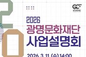 [ 타임즈 - 김시창 기자 ] (재)광명문화재단은 2026년 (재)광명문화재단 사업설명회를 3월 11일 오후 2시 광명시민회관 리허설룸에서 개최한다. 이번 설명회는 광명문화재단의 2026년 비전 및 추진 방향을 시작으로 지역(생활) 문화, 공연·전시, 문화예술교육 및 지원, 문학 사업 소개와 참가자 질의응답 순서로 진행된다. 특히 재단에서 진행하는 공모사업을 ‘2026 광명문화재단 문화예술지원 사업 통합공모’로 묶어 소개하여 각 프로그램의 주요 내용, 운영 일정, 신청 방법 등 정보를 자세하고 정확하게 접할 수 있다. (재)광명문화재단 송은영 대표이사는“재단이 준비한 다양한 사업을 시민 여러분께 직접 소개하고 의견을 듣는 뜻깊은 자리”라며 “이번 사업설명회를 통해 더 많은 분들이 관심을 갖고 여러 사업에 편하게 참여해 주시면 좋겠다.”라고 밝혔다.