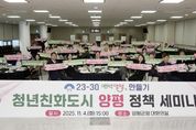 [ 타임즈 - 김시창 기자 ] 양평군은 지난 4일 오후 3시 양평군청 대회의실에서 ‘청년친화도시 조성을 위한 미래 방향성과 차별화 전략’을 주제로 ‘23-30 매력 양평 만들기’ 정책세미나를 개최했다. 이번 세미나는 청년이 머물고 싶은 도시, 청년이 주도적으로 참여할 수 있는 ‘매력양평’ 구현을 위한 실질적인 정책 방향을 논의하고자 마련됐다. 이날 행사에는 전진선 양평군수를 비롯해 양평군의회, 양평군 정책자문단, 청년정책위원회, 청년단체 등 관계자 100여 명이 참석했다. 1부에서는 인사말씀과 축사, 기념촬영이 진행됐으며, 2부에서는 손신 교수(아신대학교, 양평군 정책자문단 위원)의 ‘청년친화도시 조성을 위한 미래 방향성 및 차별화 전략’과 길청순 이사장(지역농업네트워크 서울경기제주협동조합, 양평군 정책자문단 위원)의 ‘농업·농촌의 미래와 청년농업인’ 발제가 이어졌다. 전진선 양평군수는 “청년이 머물고 싶은 도시, 청년이 주도적으로 참여할 수 있는 ‘매력양평’을 만들기 위해 행정과 지역사회가 함께 힘을 모아야 한다”며 “오늘 세미나에서 제시된 다양한 의견을 향후 청년정책에 적극 반영하겠다”고 밝혔다.