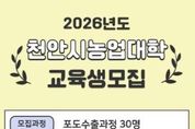 [ 타임즈 - 김시창 기자 ] 천안시농업기술센터는 내달 6일까지 ‘2026년도 천안시농업대학’ 교육생 30명을 모집한다고 23일 밝혔다. 천안시농업대학은 시의 농업을 선도할 신지식 농업인 양성을 목표로 운영되고 있으며, 현재까지 18기 35개 과정을 통해 1,139명의 졸업생을 배출했다. 올해는 포도 수출 확대와 경쟁력 강화를 위해 ‘포도수출 과정’을 개설·운영할 예정이다. 모집 대상은 천안시에 주소를 둔 농업인 또는 농업 종사 예정자로, 입학원서는 센터에 방문하거나 전자우편을 통해 제출하면 된다. 자세한 사항은 센터 교육운영팀으로 문의하면 된다.