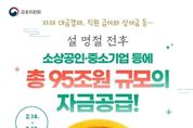 [ 타임즈 - 임성희 기자 ] 자재 대금결제, 직원 급여와 상여금 등… 설 명절 전후 소상공인·중소기업 등에 총 95조 원 규모의 자금공급! (2.14.~2.18.) - 중소·중견기업 ■ 특별대출, 보증 · 지원기간: ~3.5. · 신청방법: 산업은행, 기업은행, 신용보증기금 지점 상담 - 중소기업·소상공인 ■ 거래 기여도, 신용등급에 따라 은행권 금리우대 대출 · 지원기간: ~3.13. *4대 시중은행 기준(타 은행은 보도자료 참고) · 신청방법: 은행 영업점 방문→설 명절 특별자금지원 상담 - 전통시장 상인 ■ 명절 자금 지원 · 내용 : 연 4.5% 이내 금리 / 최대 1000만 원 대출 · 지원기간: ~2.13. · 신청방법: 우수시장(기초지자체 추천) 소속 상인이 상인회에 신청