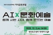 [ 타임즈 - 김시창 기자 ] 천안문화재단은 내달 2일 천안축구센터에서 ‘2025 천안문화재단 지식공유포럼’을 개최한다고 6일 밝혔다. 이번 포럼은 ‘AI✕문화예술 : 함께 사는 시대, 함께 만드는 예술’을 주제로 인공지능(AI)의 급속한 발전이 우리의 삶과 문화예술에 미치는 영향을 살펴보고, 변화하는 환경 속에서 예술의 새로운 방향을 모색하기 위해 마련됐다. 포럼 1부에서는 김윤경 한국문화관광연구원 부연구위원이 ‘AI시대 문화예술계 변화와 현장 대응 전략’을, 김지현 중부대학교 사진영상학과 교수가 ‘예술가의 AI 창작 실험 및 제작 사례’를 주제로 발제한다. 이어 2부에서는 허대찬 미디어문화예술채널 앨리스온 편집장과 이지용 단국대학교 글로벌 K-컬처 인문사회융합인재단 교수, 최수웅 단국대학교 문예창작과 교수가 참여해 ‘AI와 예술의 공존’에 대해 토론을 진행할 예정이다. 이번 포럼을 통해 AI 시대의 예술 창작과 유통·향유 방식의 변화를 살피고, 지역 문화생태계의 미래 방향을 고민하는 자리가 될 것으로 기대하고 있다. 포럼은 무료로 진행되며, 참가를 희망하는 시민은 재단 누리집 또는