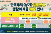 [ 타임즈 - 김시창 기자 ] 원주시는 설 연휴 동안 생활폐기물로 인한 시민 불편을 최소화하고 쾌적한 명절 분위기를 조성하기 위해 ‘설 연휴 생활폐기물 관리 대책’을 선제적으로 추진한다. 연휴 기간인 2월 14일부터 18일까지는 ‘생활폐기물 대책 상황반’과 청소 대행업체 19개 반, 53명으로 구성된 ‘기동처리반’이 가동된다. 이들은 무실동 롯데시네마, 단계동 장미공원길, 중앙시장 등 폐기물 적체가 예상되는 주요 거점을 순찰하고 관련 민원을 신속히 처리할 계획이다. 일요일인 2월 15일과 설 당일인 17일, 설 다음 날인 18일은 수거하지 않으므로, 단독주택과 상가 지역은 2월 15일과 18일 일몰 후에 배출하면 된다. 장성미 자원순환과장은 “연휴 기간 생활폐기물 수거 일정을 참고하셔서 깨끗한 원주시를 함께 만들어 주시길 바란다”라고 말했다.