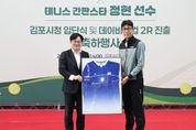 [ 타임즈 - 김시창 기자 ] 김포시는 17일 솔터실내테니스장에서 대한민국 테니스 스타 정현 선수의 김포시청 직장운동경기부 테니스팀 입단을 기념하고, 데이비스컵 2라운드 진출을 축하하는 행사를 개최했다. 이날 행사에는 김병수 김포시장을 비롯해 임청수 김포시체육회장, 박헌규 김포시테니스협회장과 테니스 관계자 및 동호인 등이 참석해 자리를 빛냈다. 행사는 시민과 동호인을 대상으로 한 팬 사인회를 시작으로 정현 선수의 주요 활약상을 담은 영상 상영, 기념 퍼포먼스, 입단 소감 및 축사 순으로 진행됐다. 특히 이날 행사에서는 정현 선수가 최근 데이비스컵 경기에서 실제 착용한 유니폼을 기념 액자로 제작해 김병수 시장에게 전달하는 의미 있는 시간이 마련됐다. 해당 유니폼은 국가대표 경기 특성상 소속팀 마크를 부착할 수 없음에도 불구하고, 정현 선수가 김포시청 입단을 기념하고 김포시를 알리기 위해 대한테니스협회에 요청해 특별히 김포시청 마크를 부착하고 출전한 것으로 알려져 의미를 더했다. 이어 김병수 시장은 정현 선수에게 꽃다발을 전달하고, 정현 선수의 유니폼에 김포시청 마크를 부착하는 퍼포먼스를 통해 김포시청