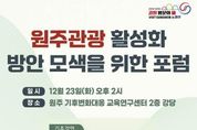 [ 타임즈 - 김시창 기자 ] 원주시는 오는 23일 오후 2시, 기후변화대응교육연구센터 2층 대강당에서 ‘원주관광 활성화 방안 모색을 위한 포럼’을 개최한다. 이번 포럼은 원주시와 강원일보가 공동으로 주최하고, 한국관광공사와 (재)강원관광재단이 후원한다. 원주 관광산업의 현주소를 진단하고 타 지역의 우수사례를 공유해, 원주관광의 발전 방향을 제시하는 자리이자, 원주 관광산업 활성화를 위한 다양한 방안과 대안을 모색하는 장이 될 전망이다. 포럼은 상상콘텐츠연구소 이종원 소장의 ‘여행작가가 바라본 강원특별자치도 원주시’ 기조강연으로 시작된다. 이어 한국관광공사 이재훈 국민관광전략팀장이 로컬관광 활성화 전략 우수사례를 공유하고, 한라대학교 배준호 교수가 원주 지역 웰니스 관광 활성화 전략을 발표했다. 또한 김혁성 원주시의원이 관광콘텐츠 개발 연구회 성과를 소개한다. 마지막으로 강원일보 권혁순 논설주간이 좌장을 맡아 상지대학교 장병주 경상대학장, 강원관광재단 원문규 관광마케팅실장, 정영직 원주시관광협의회장이 토론을 진행하며 질의응답 시간을 갖는다. 원강수 원주시장은 “이번 포럼에서 제시되는 창의적이고 심도