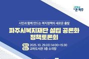 [ 타임즈 - 김시창 기자 ] 파주시는 오는 29일 14시, 교하도서관 3층 소극장에서 ‘파주시복지재단 설립 공론화 정책토론회’를 개최한다고 밝혔다. 이번 토론회는 파주시복지재단 설립을 앞두고 시민, 전문가, 현장 종사자의 다양한 의견을 수렴해 재단 설립의 필요성과 발전 방향을 함께 모색하기 위해 마련됐다. 토론회는 김민철 서영대학교 사회복지행정학과 교수의 기조 강연을 시작으로, 파주시 복지기획팀장의 주제 발표가 이어진다. 이어 한지원 두원공과대학교 교수가 좌장을 맡아 토론을 진행하며, 이보경 파주시문산종합사회복지관 관장, 오민수 경기복지재단 선임연구위원, 박윤근 화성시복지재단 사업본부장 등이 참석해 열띤 논의를 펼칠 예정이다. 토론에서는 ▲파주시복지재단 설립의 필요성과 추진 개요 ▲파주시 여건을 반영한 복지재단의 발전 방향 ▲재정 자립 및 지속가능성 확보 방안 등 다양한 주제가 심도 있게 논의될 예정이다. 김은숙 복지정책국장은 “파주시복지재단은 시민의 삶을 보다 세밀하게 지원하고, 지역 현장의 목소리를 반영한 ‘파주형 복지모델’을 실행할 구심점이 될 것”이라며, “이번 토론회를 통해 파주시 복지