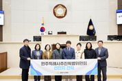 [ 타임즈 - 김시창 기자 ] 용인특례시의회는 30일 의장실에서 원주시의회 원주특례시추진특별위원회의 방문을 받고 특례시 추진 및 운영 사례를 공유하는 시간을 가졌다고 밝혔다. 이번 방문은 특례시 추진을 준비 중인 원주시의회가 용인특례시의회의 제도 운영 경험과 의회 조직·권한 구조를 벤치마킹하기 위해 마련됐다. 용인특례시의회에서는 유진선 의장을 비롯해 이윤미 의회운영위원장, 김희영·이진규·기주옥 의원이 참석했으며, 용인특례시 자치분권과 관계자들도 함께했다. 원주시의회 원주특례시추진특별위원회에서는 손준기 위원장과 최미옥·문정환 의원 등 관계자들이 참석했다. 이날 일정은 상호 소개를 시작으로 ▲특례시 운영 현황 및 제도적 기반에 대한 설명 ▲특례시 추진 과정과 의회 역할 공유 ▲의회 시설 견학 순으로 진행됐다. 특히, 참석자들은 ‘지방자치법’과 ‘지방자치분권 및 지역균형발전에 관한 특별법’ 등 특례시 관련 법령 체계, 인구 100만 이상 대도시의 행·재정 수요 증가에 따른 특례시 도입 배경과 필요성, ‘특례시의회 사무기구 구성과 정책지원 전문인력 운영 사례 등에 대해 심도 있는 의견을 나눴다.