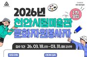 [ 타임즈 - 김시창 기자 ] 천안문화재단은 오는 31일까지 천안시립미술관 문화자원봉사자 2차 모집을 추진한다고 18일 밝혔다. 문화자원봉사자는 미술관과 관람객을 이어주는 매개자로, 누구나 미술관을 친근하고 편안하게 찾을 수 있는 공간으로 만들어 가는 역할을 하게 된다. 문화예술에 관심이 있는 20세 이상 성인이라면 누구나 참여할 수 있으며, 문화자원봉사자로 선발되면 내달부터 2027년 2월까지 전시 해설, 관람 안내, 질서 유지, 행사 지원 등 다양한 활동을 수행하게 된다. 문화자원봉사자에게는 봉사실적 인정, 교육, 소정의 활동비 등 혜택이 제공될 예정이다. 지원 희망자는 천안시립미술관 누리집에서 신청서를 내려받아 전자우편으로 접수하면 된다. 서류 및 인터뷰 심사를 통해 활동 의지와 전문성 등을 종합적으로 평가할 예정이며, 최종합격자에게는 내달 10일 개별 통보된다. 자세한 사항은 천안시립미술관 누리집을 참고하면 된다.