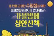 [ 타임즈 - 김시창 기자 ] 청주시는 2026학년도 대학수학능력시험을 치른 수험생을 대상으로 ‘가을밤에 성안산책’ 프로그램에서 특별 이벤트를 진행한다고 12일 밝혔다. 11월 성안산책 프로그램에 참여한 수험생에게 성안길상점가에서 사용할 수 있는 상품권(5천원)을 제공하는 내용으로, 2026학년도 수능 수험표를 소지한 수험생에게 적용된다. 가을밤에 성안산책은 9~11월 매주 금요일과 토요일 오후 7시부터 8시까지 한 시간 동안 청주 원도심 문화유산 5곳을 돌며 청주시 문화관광해설사의 해설을 듣는 프로그램이다. 참가 신청은 청주여기 모바일 앱을 통해 가능하며, 사전 신청한 선착순 40명에 한해 상품권이 지급될 예정이다. 한편, 가을밤에 성안산책은 오후 7시 이후 유동 인구가 급감하는 성안길과 중앙공원 일대를 활성화하기 위해 기획됐다. 지난 10일 기준 누적 참여인원은 558명을 기록, 원도심을 대표하는 신규 야간관광 체험 콘텐츠로 자리매김하고 있다. 이현숙 관광과장은 “시험을 마친 수험생들이 가을밤 정취를 마음 편히 즐기고, 올 한해 지친 마음을 치유할 수 있는 알찬 시간이 되길 바란다”