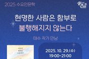 [ 타임즈 - 김시창 기자 ] 인천광역시교육청서구도서관은 10월 29일 오후 7시부터 9시까지 『어른의 행복은 조용하다』의 저자 태수 작가를 초청해 ‘수요인문학’ 강연 ‘현명한 사람은 함부로 불행해지지 않는다’를 진행한다. ‘수요인문학’은 서구도서관이 2020년부터 운영해온 대표 인문학 프로그램으로, 올해 하반기부터는 대면과 비대면 방식을 병행해 운영되고 있다. 이번 강연은 함께읽기 프로그램과 연계해 도서관 1층 북카페에서 진행되며, 태수 작가가 일상 속 작은 행복과 마음의 균형을 주제로 강연한다. 참가 신청은 10월 17일 오전 10시부터 가능하며, 자세한 사항은 서구도서관 누리집 또는 독서문화과로 문의하면 된다.