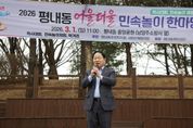 [ 타임즈 - 김시창 기자 ] 남양주시는 지난 28일 병오년 정월대보름을 맞아 호평동 사회단체협의회가 호평평내행정복지센터 앞마당에서 주민과 함께하는 지신밟기 및 척사대회를 개최했다고 3일 밝혔다. 이날 행사에는 호평동 사회단체회원과 지역 주민 등 200여 명이 참여한 가운데 진행됐다. 행사는 천마산풍물패 사물놀이로 흥겨운 시작을 알렸다. 이어 호평동 주민의 안녕과 번영을 기원하는 지신제를 올려 전통문화의 의미를 더했다. 윷놀이 경기에서는 이웃 간 정을 나누는 주민 화합의 장이 펼쳐졌다. 주광덕 남양주시장은 “우리 고유의 민속놀이 지신밟기와 척사대회 추진에 애써주신 사회단체 여러분께 감사하다”며 “붉은 말의 해를 맞아 남양주시가 인구 100만 메가시티로 도약하고, 시민이 체감할 수 있는 자족도시로 성장하는 뜻깊은 한 해가 되길 기원하며 시에서도 최선의 노력을 다하겠다”고 전했다. 이번 행사를 주관한 권순욱 회장은 “오늘 행사에 참여한 지역 주민들의 건강과 평안을 기원한다”며 “앞으로도 다양한 행사를 통해 호평동 주민이 함께 화합할 수 있도록 더욱 노력하겠다”고 밝혔다.