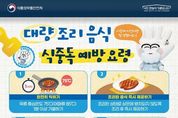 [ 타임즈 - 임성희 기자 ] ■ 대량 조리 음식 식중독 예방요령 ① 완전히 익히기 육류 중심온도 75°C(어패류 85°C) 1분 이상 가열하기 ② 조리된 음식 즉시 제공하기 조리된 상태로 상온에 방치되지 않도록 조리 후 즉시 제공하기 ③ 가열 조리 후 신속히 냉각하기 가열 조리 후 즉시 섭취하지 않을 시, 여러 용기로 나누어 담거나 신속히 냉각하기 ④ 보관온도 유지하기 따뜻한 음식은 60°C 이상, 차가운 음식은 5°C 이하로 보관하기 ⑤ 재가열하여 섭취하기 보관된 음식 섭취 시, 충분히 가열 후 섭취하기 ■ 운반 시 식중독 예방 요령 · 차량·운반기구 청결히 관리하기 - 오염되기 쉬운 곳 세척·소독하고 청결 상태 수시로 확인하기 · 운반 시 음식 온도 관리 주의 - 따뜻한 음식과 차가운 음식이 서로 닿지 않게 구분하기 · 안전하게 포장하기 - 음식이 새거나 오염되지 않도록 완전히 밀폐되게 포장하기 · 운반 후 즉시 제공하기 - 음식 운반이 완료되면 즉시 제공하기