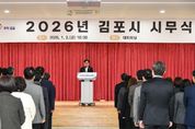 [ 타임즈 - 김시창 기자 ] 김포시가 2일 오전 10시, 시청 본관 3층 대회의실에서 ‘2026년도 시무식’을 열고 붉은 말 병오년(丙午年) 새해의 힘찬 출발을 알렸다. 이날 시무식에는 김병수 김포시장을 비롯해 실·국·소장, 부서장 등 간부 공직자 100여 명이 참석해 새해 시정 운영 방향을 공유하고, 시민 중심의 시정 추진과 새로운 도약을 향한 결의를 다졌다. 행사는 국민의례를 시작으로 공무원 헌장 낭독, 신년사 순으로 차분하고 엄숙하게 진행됐으며, 참석자들은 시무식을 통해 공직자로서의 사명과 책임을 다시 한 번 되새기는 시간을 가졌다. 김병수 김포시장은 신년사에서 “붉은 말의 해는 뜨거운 열정과 강한 추진력을 상징한다”며 “올해는 이 기운을 받아 ‘시민의 상상이 현실이 되는 김포’를 시민 한 분 한 분이 실제로 느낄 수 있도록 시정 역량을 집중해 나가겠다”고 밝혔다. 아울러 “속도감 있는 행정과 책임 있는 실천으로 김포의 미래 경쟁력을 더욱 높여 나가겠다”고 덧붙였다. 한편, 시무식을 마친 뒤 참석자들은 서로 새해 인사를 나누며 올 한 해 시정 운영에 대한 각오를 공유하는 시간을 가졌으며, 시