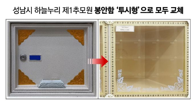 [ 타임즈 - 김시창 기자 ] 성남시가 운영하는 봉안시설인 하늘누리 제1추모원(중원구 갈현동 소재)의 1만6900개 봉안함(화장 유골함을 모셔놓는 곳)이 연말까지 투시형으로 모두 교체 완료된다.