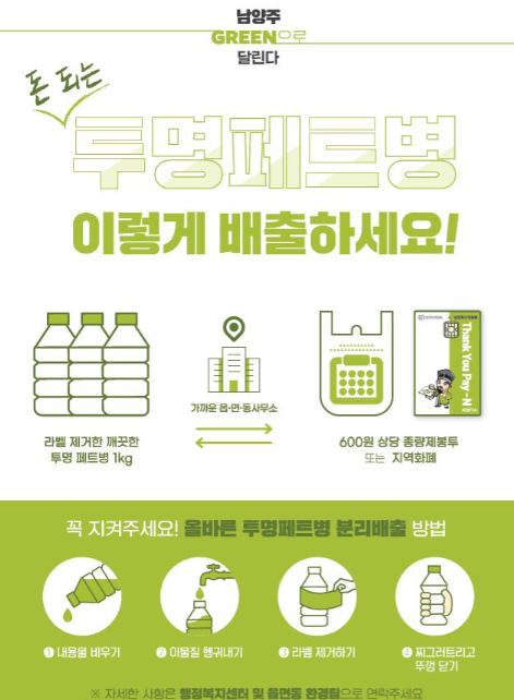 타임즈 임지연 기자 | 남양주시는 환경 혁신의 일환으로 1일부터 투명 페트병을 관내 16개 읍·면·동사무소로 가져오는 시민에게 1kg당 600원 상당의 지역화폐 또는 종량제 봉투를 지급하는 사업을 전면 시행한다.