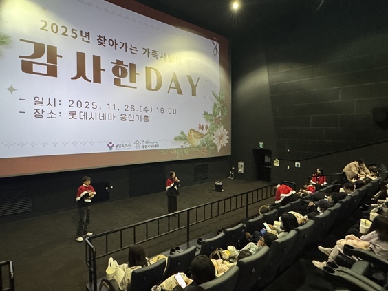 [ 타임즈 - 김시창 기자 ] 지구촌사회복지재단 용인시가족센터(센터장 유지영)는 지난 26일 2025년 한 해 동안 센터를 이용한 가족들에게 감사의 마음을 전하기 위해 ‘11월 찾아가는 가족사랑의 날-감사한 DAY’ 행사를 진행했다고 밝혔다. 가족사랑의 날은 매월 가족 간 문화 활동을 통해 유대감을 형성하고자 진행하고 있으며, 이번 가족사랑의 날은 연말을 맞이해 가족영화 관람으로 기흥AK 롯데시네마에서 진행됐다.