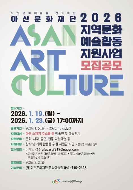 [ 타임즈 - 김시창 기자 ] (재)아산문화재단은 지역 예술인의 안정적인 창작 환경을 조성하고 문화예술 생태계의 전문성을 강화하기 위해 ‘2026 지역문화예술 활동지원사업’ 공모를 시작한다.