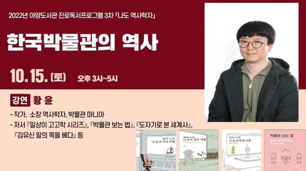 타임즈 김시창 기자 | 안성시 아양도서관은 오는 10월 15일 오후 3시 역사학자 황윤 작가를 초청해 ‘한국박물관의 역사’ 강연회를 개최한다고 밝혔다.