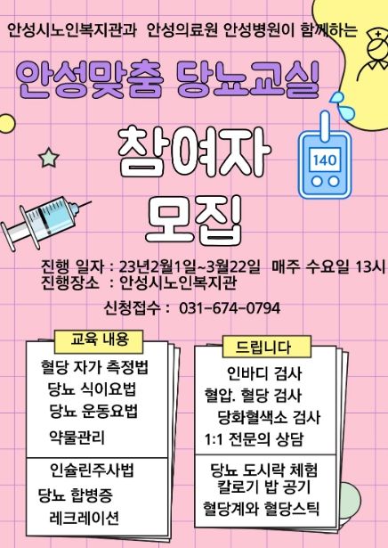 “안성맞춤 당뇨교실”은 당뇨진단을 받거나 당뇨 전 단계이신 60세 이상 안성시 거주자는 누구나 참여 할 수 있으며 수업은 무료로 진행 된다. 프로그램 참여 희망자는 안성시노인복지관에 방문해 신청하거나 전화로도 신청가능하다.